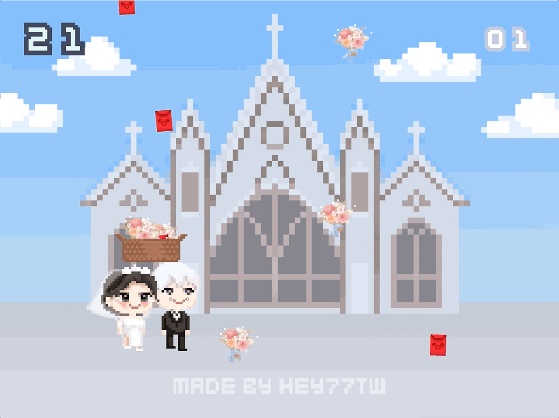 我們採用接物遊戲模板,客製化繪製新人角色造型,設計婚禮教堂背景,將捧花轉換為掉落物。設計簡單直覺的操作方式,讓不同年齡層的賓客都能參與,讓賓客在接捧花的過程中享受遊戲樂趣。